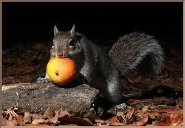 Everyone is eating more as nights are started to become cooler. Our squirrels are enjoying the extra apples on the trees. It is funny to watch them carry an apple around (they usually are as big as their heads) in their jaws and then try to bury them. But they don’t dig a hole. No, our squirrels sort of try to just push the apple in the dirt, hoping that by some miracle, it will bury itself. Dirt-covered apples, yummy.~ by Sherry Jury